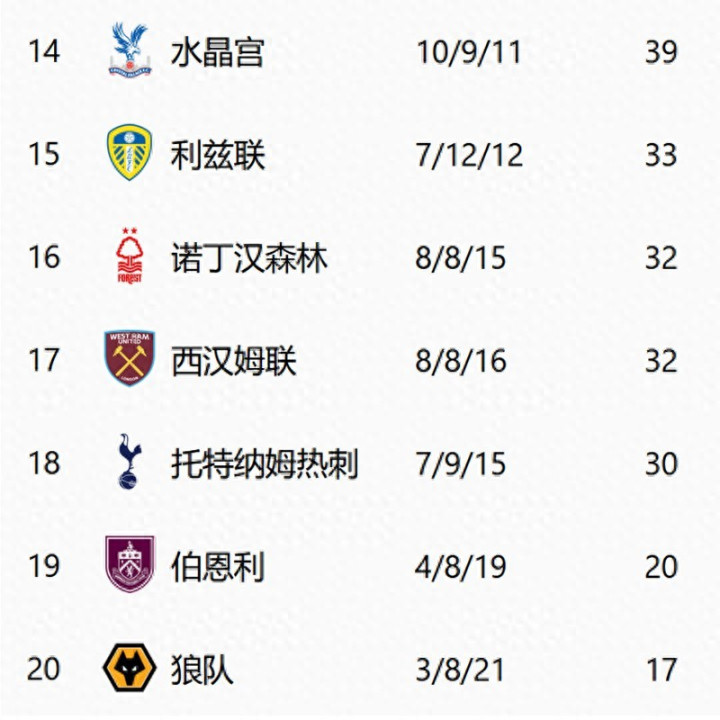 从最新的积分榜来看,英超只剩下最后7轮比赛,伯恩利和狼队分别只有20分和17分,狼队多赛一场,两队降级基本没有悬念。少赛一场的水晶宫有39分,排在第14名,从这里往上的所有球队,基本上没有降级的可能。