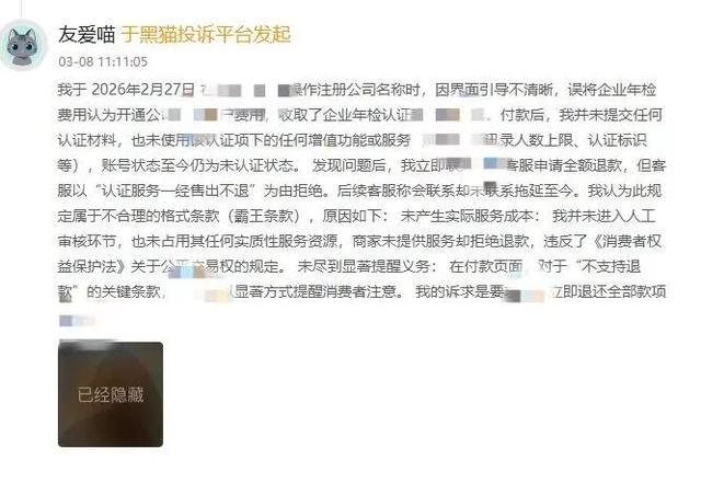 有用户在黑猫投诉平台投诉称,其在某协同办公软件上操作注册公司名称时,因界面引导不清晰,误将企业年检费用认为是开通公司该软件账户的费用,发现问题申请退款时却被客服告知“认证服务一经售出不退”。